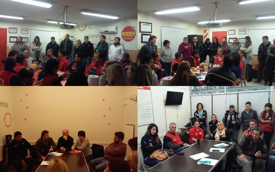 Los delegados de Cencosud tenían pautadas dos reuniones en los locales de Easy Quilmes y Lomas, en ambas se citó a los jefes de los locales para realizar un relevamiento de los últimos aumentos, afiliar y contar los ultimos logros del gremio en la empresa. Ademas el compañero Marcelo Molina estuvo en Easy Moreno charlando con los jefes.