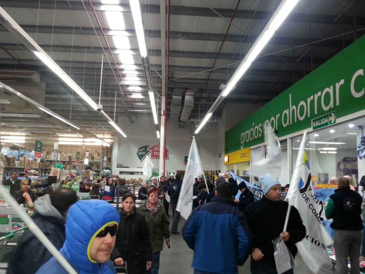 Desde la 10 hs. comenzó la manifestación y la columna de compañeros se aposto en la línea de cajas con los elementos de percusión y banderas, se informó a los clientes con folletos explicando la maniobra de la empresa para despedir a la compañera.
